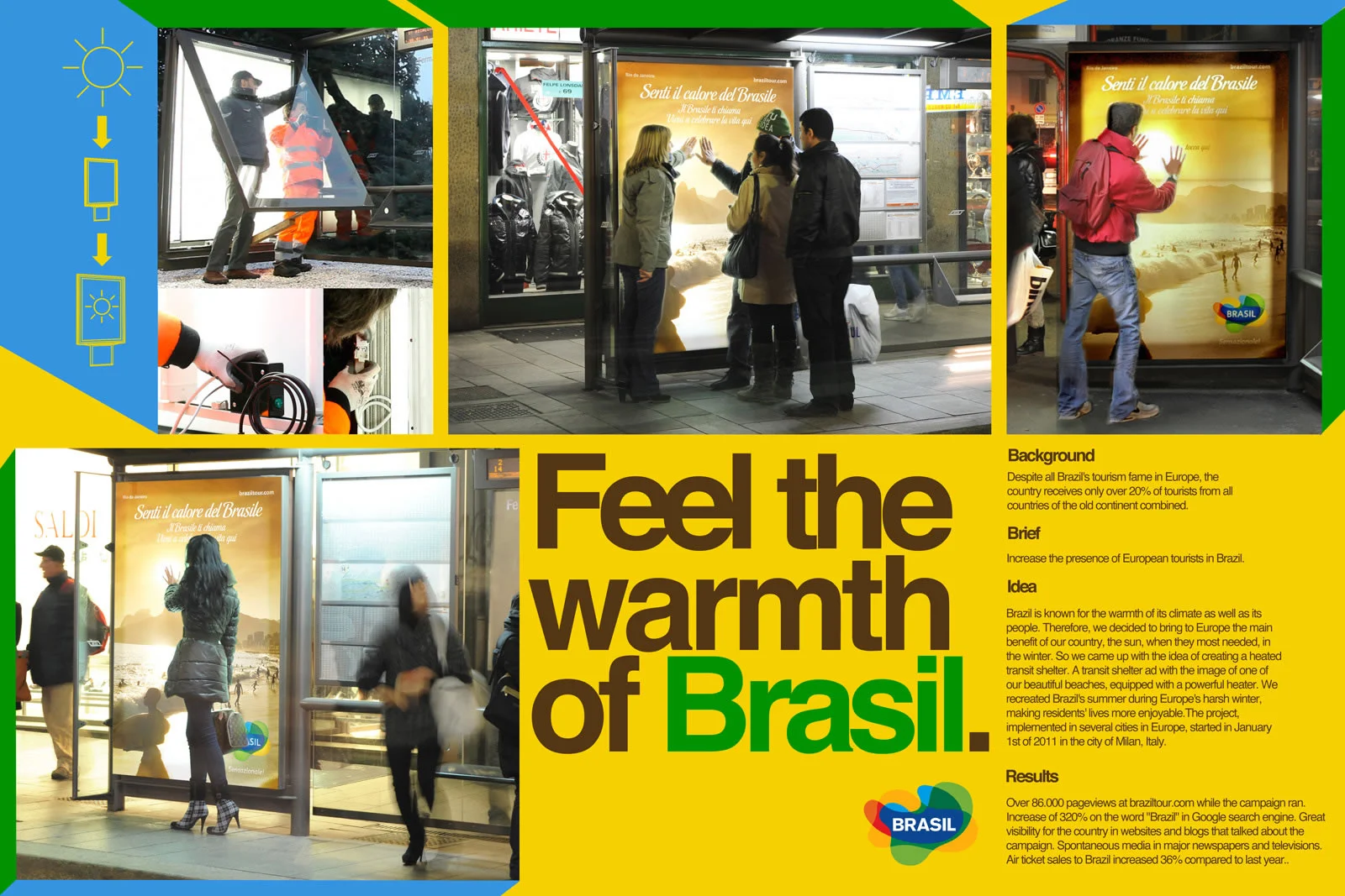 Embratur (Brazilian Tourism Board) wanted to put Brazil's famous sun in a box and send it to each european citizen so they could feel how warm Brazil is during their winter. So we came up with a solution: a transit shelter ad with the image of one of our beautiful beaches, equipped with a powerful heater under the image of the sun.